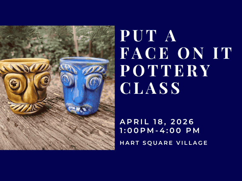 Apr 18 Put a Face on It Pottery Class 1:00 pm - 4:00 pm Hart Square Village 5055 Hope Road, Vale Event Details Get Directions