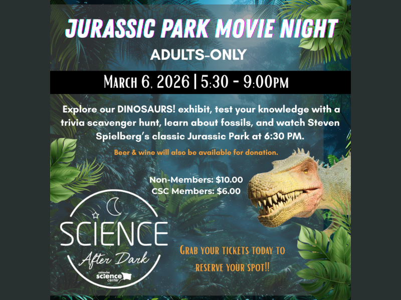 Science After Dark- Jurassic Park Movie Night Mar 6 Science After Dark- Jurassic Park Movie Night 5:30 pm - 9:00 pm $6 – $10