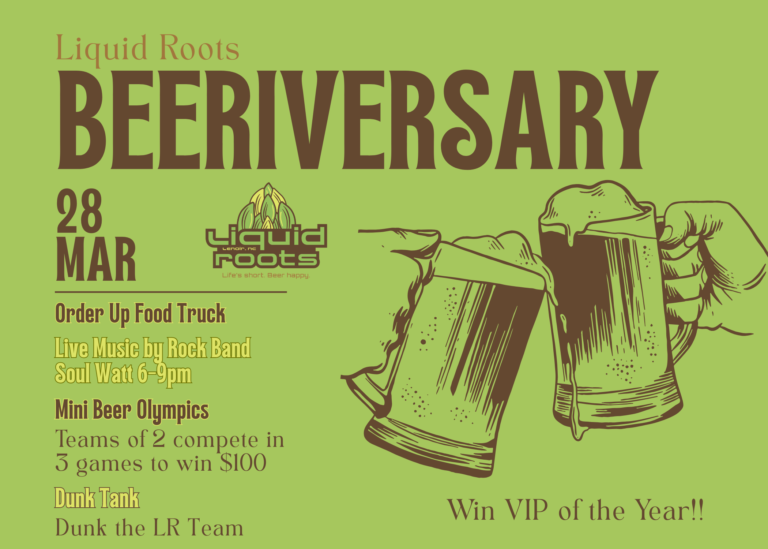 Thanks for drinking Liquid Roots Beer for 7 Years!! Let’s Celebrate!! We have a day of fun planned! Compete in our Mini Beer Olympics, Dunk the LR Team, submit your best beer name for our Beer Naming Contest. Wear your LR merch for a chance to be our VIP for the Year! VIP gets a $120 LR Gift Card plus […]
